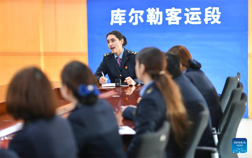 La conductora de tren Airkir Duliki organiza un estudio de formación profesional en Korla, en la región autónoma uygur de Xinjiang, en el noroeste de China, el 15 de enero de 2025. Airkir Duliki, la primera conductora de tren de etnia tayika de China, nació y creció en medio de las montañas nevadas y los pastizales en una aldea del distrito autónomo tayiko de Taxkorgan, en la meseta del Pamir. (Xinhua/Hu Huhu.)