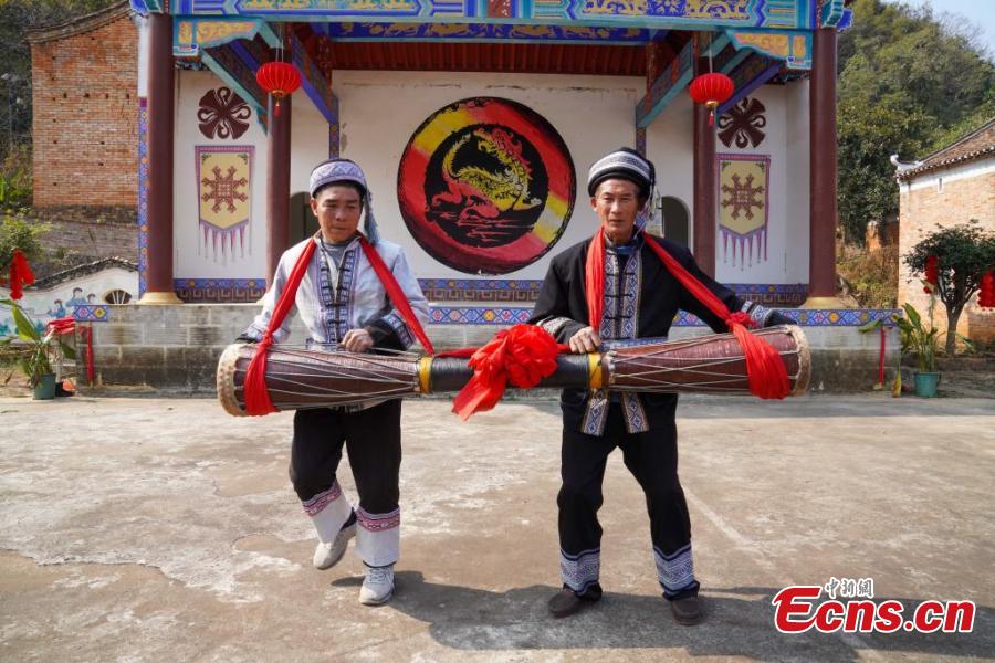 Los aldeanos bailan la Danza del Tambor Largo con motivo de la Fiesta de la Primavera en Guangxi