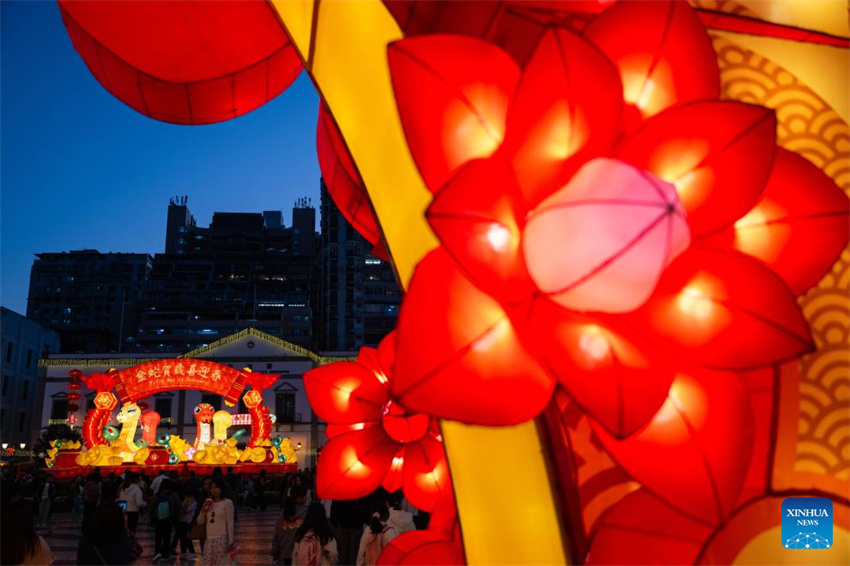 Instalaciones de luz para celebrar la próxima Fiesta de la Primavera, o Año Nuevo chino lunar, en la plaza del Senado de Macao, en el sur de China, el 25 de enero de 2025. (Xinhua/Cheong Kam Ka.)