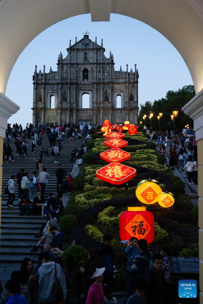 Instalaciones de luz para celebrar la próxima Fiesta de la Primavera, o Año Nuevo chino lunar, frente a las Ruinas de San Pablo en Macao, en el sur de China, el 25 de enero de 2025. (Xinhua/Cheong Kam Ka.)