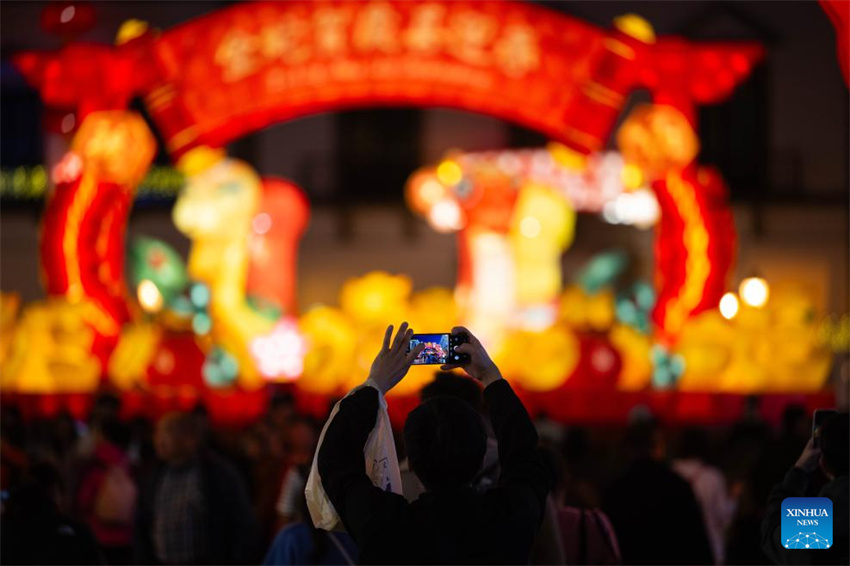 Un ciudadano toma fotos de las instalaciones de luz en celebración de la próxima Fiesta de la Primavera, o Año Nuevo chino lunar, en la Plaza del Senado en Macao, en el sur de China, el 25 de enero de 2025. (Xinhua/Cheong Kam Ka.)