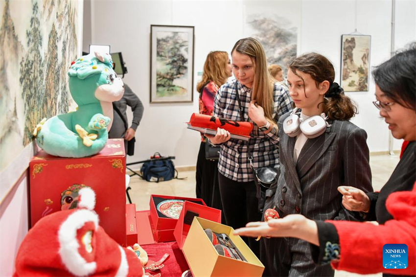 La gente mira los productos culturales y creativos en el Centro Cultural de China en Moscú, Rusia, el 25 de enero de 2025. Con motivo del Año Nuevo chino, dicho centro celebró un evento que atrajo a un gran número de visitantes. (Xinhua/Cao Yang.)