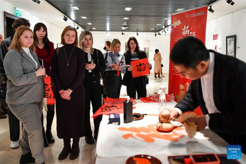 La gente observa a un miembro del personal que compone el carácter chino «fu» (que significa felicidad, bendición y buena fortuna) a través de la técnica tradicional de frotado en el Centro Cultural de China en Moscú, Rusia, el 25 de enero de 2025. Con motivo del Año Nuevo chino, dicho centro celebró un evento que atrajo a un gran número de visitantes. (Xinhua/Cao Yang.)