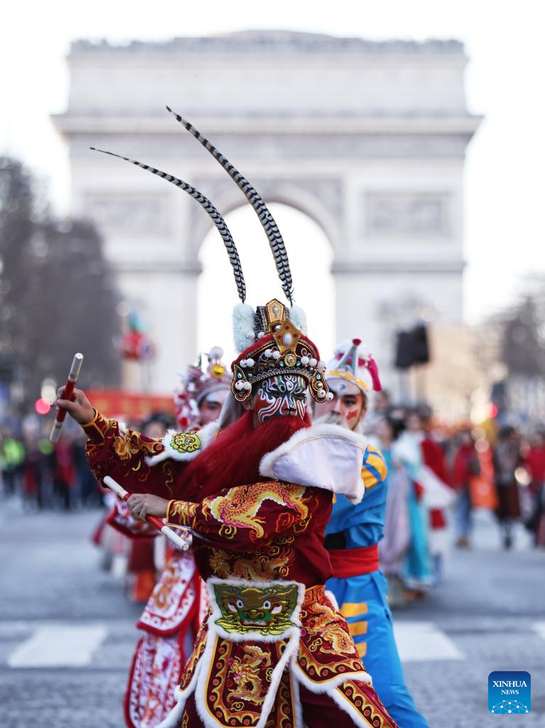 Miembros de un equipo Yingge interpretan la danza Chaoyang Yingge durante la celebración de la Fiesta de la Primavera en la Avenida de los Campos Elíseos de París, Francia, el 2 de febrero de 2025. (Xinhua/Gao Jing.)