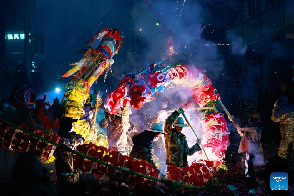Desfile de farolillos de dragón atrae a los turistas en el distrito de Shibing, provincia suroccidental china de Guizhou