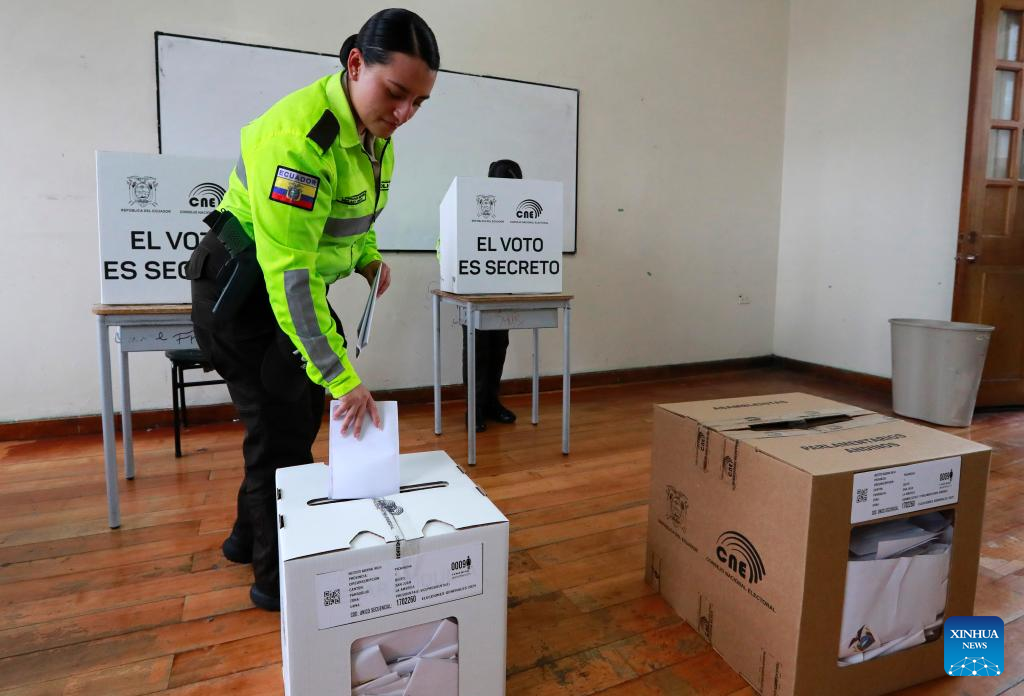 Una miembro de la Policía Nacional emite su voto en un colegio electoral, en la ciudad de Quito, Ecuador, el 9 de febrero de 2025. Las mesas electorales cerraron el domingo en Ecuador, luego de la jornada de comicios presidenciales y legislativos a los que fueron llamados a las urnas más de 13,7 millones de ecuatorianos dentro y fuera del país sudamericano, informó el Consejo Nacional Electoral (CNE). (Xinhua/Ricardo Landeta)