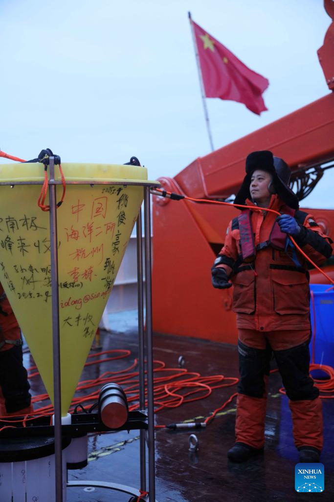 Un miembro del equipo de la 41.ª expedición antártica de China se prepara para liberar una boya subsuperficial a bordo del rompehielos de investigación chino Xuelong 2, el 4 de febrero de 2025. El rompehielos de investigación chino Xuelong 2, o Dragón de Nieve 2, está llevando a cabo un estudio del ecosistema marino de un mes de duración en el Mar de Amundsen, que incluye una investigación exhaustiva y el seguimiento de la ecología biológica, el agua, los sedimentos y el medio ambiente atmosférico, y la distribución de contaminantes. (Xinhua/Huang Taoming)