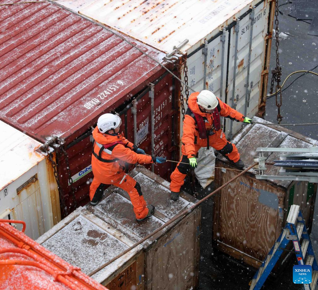 Un miembro del equipo de la 41.ª expedición antártica china desmonta el equipo para recoger muestras de sedimentos marinos a bordo del rompehielos de investigación chino Xuelong 2, el 10 de febrero de 2025. El rompehielos de investigación chino Xuelong 2, o Dragón de Nieve 2, está llevando a cabo un estudio del ecosistema marino de un mes de duración en el Mar de Amundsen, que incluye una investigación exhaustiva y el seguimiento de la ecología biológica, el agua, los sedimentos y el medio ambiente atmosférico, y la distribución de contaminantes. (Xinhua/Huang Taoming.)