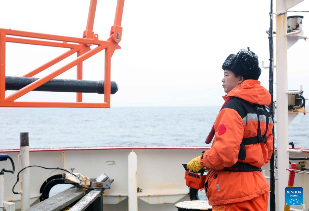 Un miembro del equipo de la 41.ª expedición antártica china acciona unos dispositivos para liberar el equipo de recogida de muestras de sedimentos marinos a bordo del rompehielos de investigación chino Xuelong 2, el 9 de febrero de 2025. El rompehielos de investigación chino Xuelong 2, o Dragón de Nieve 2, está llevando a cabo un estudio del ecosistema marino de un mes de duración en el Mar de Amundsen, que incluye una investigación exhaustiva y el seguimiento de la ecología biológica, el agua, los sedimentos y el medio ambiente atmosférico, y la distribución de contaminantes. (Xinhua/Huang Taoming.)