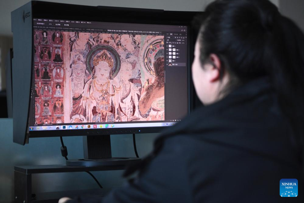 Un empleado edita imágenes murales en un ordenador en la Academia de Dunhuang, en Dunhuang, provincia noroccidental china de Gansu, el 25 de abril de 2023. Hace unos 2000 años, Dunhuang era un punto clave de la antigua Ruta de la Seda. La seda y el té chinos pasaban por esta puerta de camino a otros países, mientras que productos agrícolas como uvas, zanahorias y granadas se abrían camino hacia China.