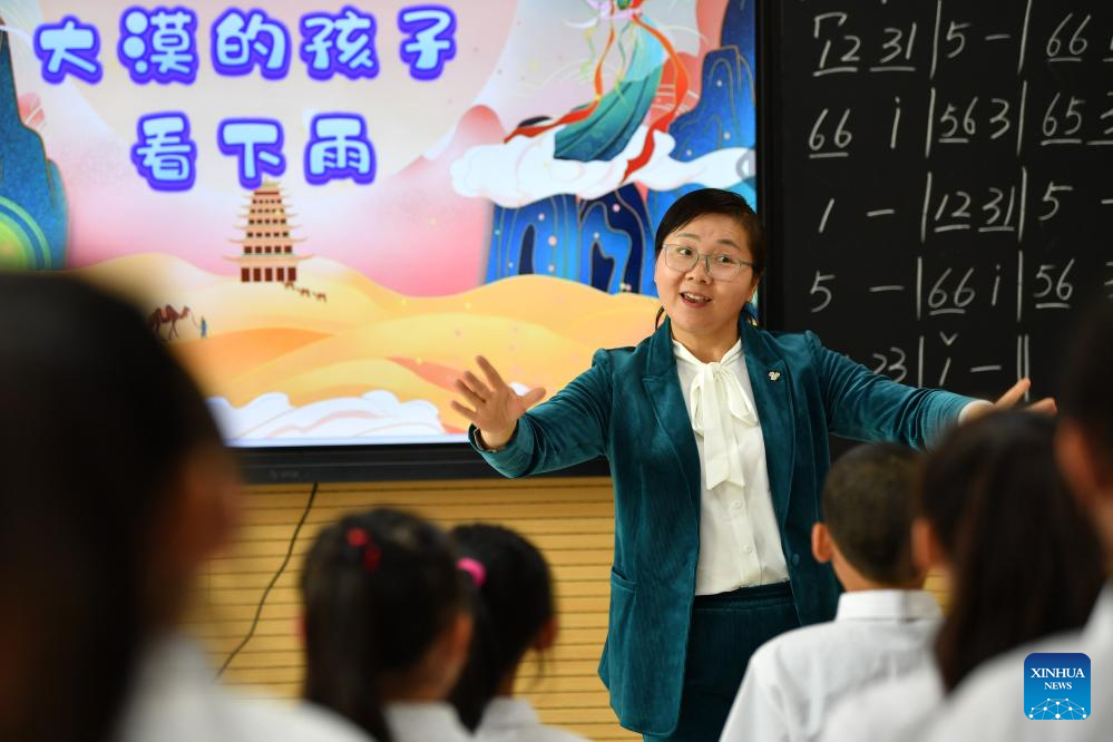 Una profesora guía a los alumnos a cantar una canción con características de Dunhuang en una escuela primaria de Dunhuang, provincia noroccidental china de Gansu, 26 de abril de 2023. Hace unos 2000 años, Dunhuang era un centro clave de la antigua Ruta de la Seda. La seda y el té chinos pasaban por esta puerta de camino a otros países, mientras que productos agrícolas como uvas, zanahorias y granadas se abrían camino hacia China.