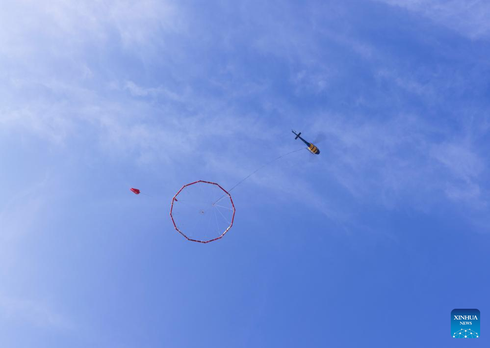 Imagen del 10 de enero de 2025 del sistema de detección magnetotelúrico aerotransportado por helicóptero funcionando en Hetian, en la región autónoma uygur de Xinjiang, en el noroeste de China. El primer sistema de detección magnetotelúrico aerotransportado por helicóptero de China se ha aplicado con éxito a un proyecto de construcción ferroviaria en una meseta, informó el martes el Instituto de Investigación de Información Aeroespacial (AIR, por sus siglas en inglés) de la Academia de Ciencias de China. (Xinhua/Guo Feng)