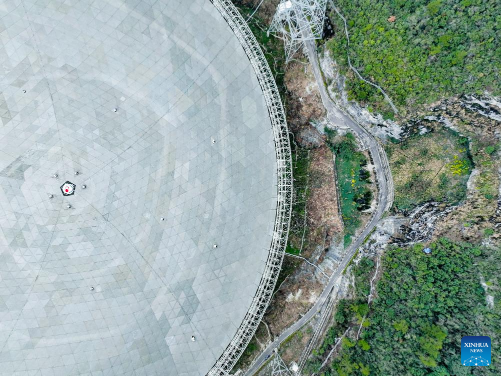 Vista aérea tomada con un dron el 18 de febrero de 2025 del Radiotelescopio Esférico de Apertura de Quinientos Metros (FAST, por sus siglas en inglés) de China en mantenimiento, en la provincia de Guizhou, en el suroeste de China. En los últimos años, Guizhou ha aprovechado sus recursos de investigación científica como el FAST para desarrollar viajes educativos por la ciencia, una opción favorable en toda China para las mentes inquisitivas que buscan embarcarse en un viaje de conocimiento y exploración en la ciencia. Por ejemplo, FAST, el radiotelescopio de un solo plato más grande del mundo, atrajo a 1.298 millones de visitantes para viajes educativos para la ciencia en 2024. (Xinhua/Ou Dongqu)