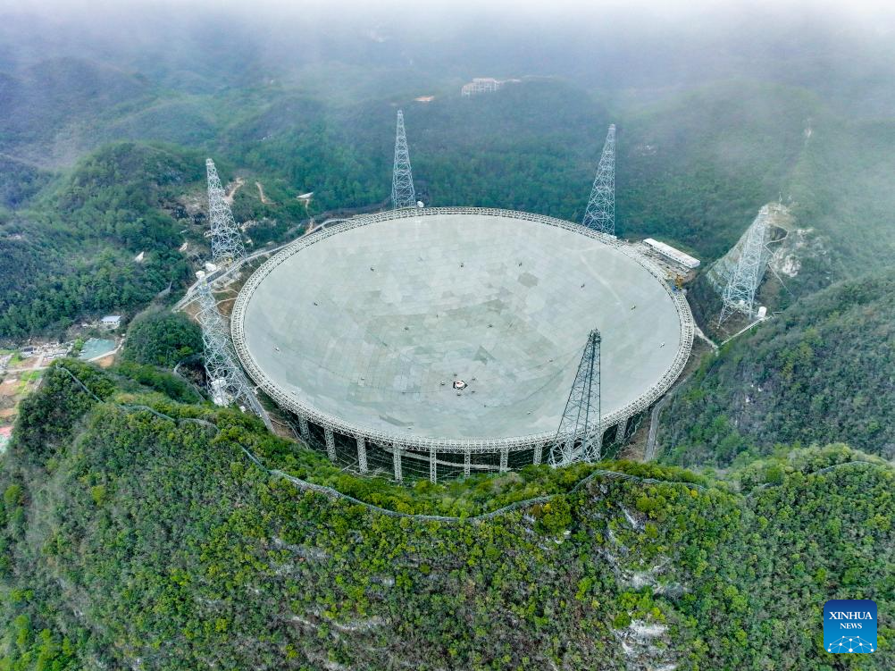Vista aérea tomada con un dron el 18 de febrero de 2025 del Radiotelescopio Esférico de Apertura de Quinientos Metros (FAST, por sus siglas en inglés) de China en mantenimiento, en la provincia de Guizhou, en el suroeste de China. En los últimos años, Guizhou ha aprovechado sus recursos de investigación científica como el FAST para desarrollar viajes educativos por la ciencia, una opción favorable en toda China para las mentes inquisitivas que buscan embarcarse en un viaje de conocimiento y exploración en la ciencia. Por ejemplo, FAST, el radiotelescopio de un solo plato más grande del mundo, atrajo a 1.298 millones de visitantes para viajes educativos para la ciencia en 2024. (Xinhua/Ou Dongqu)