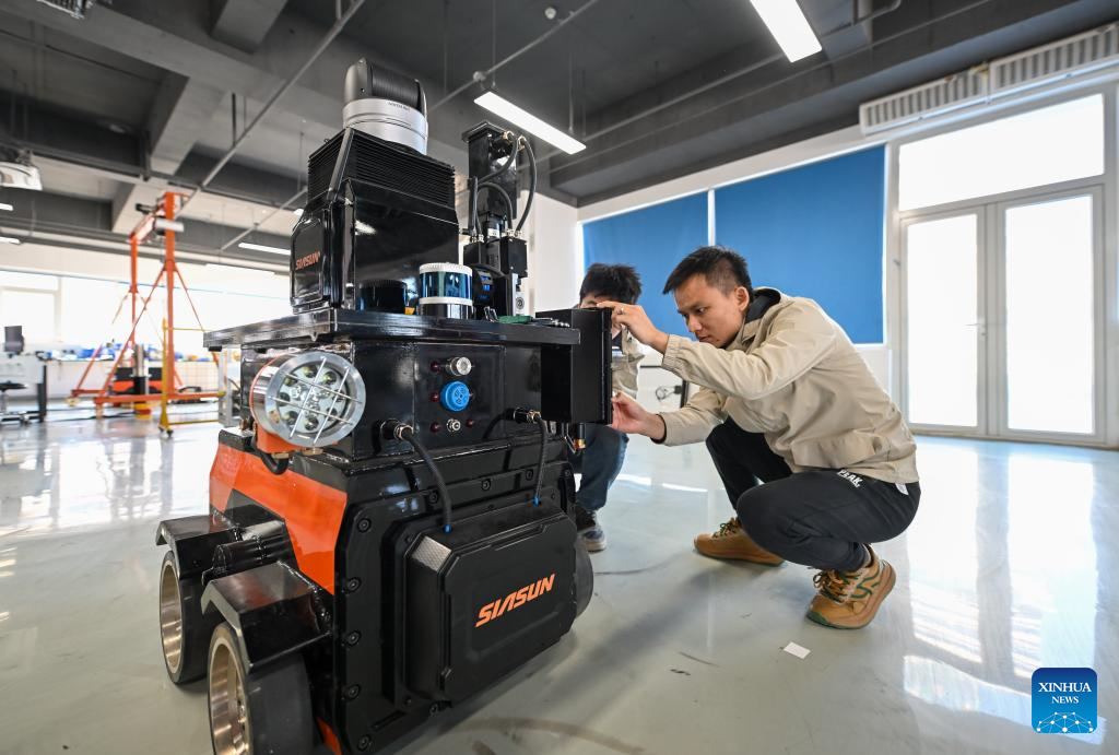 Miembros del personal comprueban un robot patrulla en Tianjin SIASUN Intelligent Technology Co, Ltd. en la ciudad tecnológica Zhongguancun de Beijing-Tianjin, en Tianjin, norte de China, el 20 de febrero de 2025.