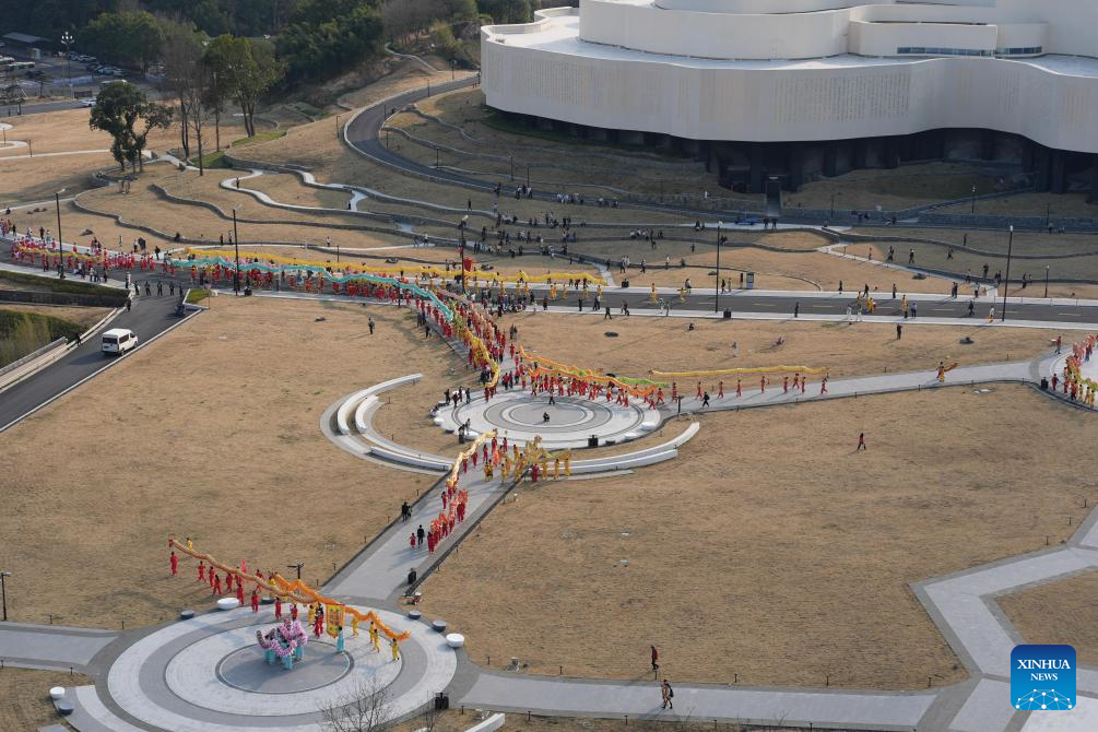 Personas realizan la Danza del Dragón de Tela de Fenghua durante un evento cultural, en Fenghua, en la provincia de Zhejiang, en el este de China, el 1 de marzo de 2025. La Danza del Dragón de Tela de Fenghua fue catalogada como patrimonio cultural inmaterial nacional de China en 2006. (Xinhua/Huang Zongzhi)