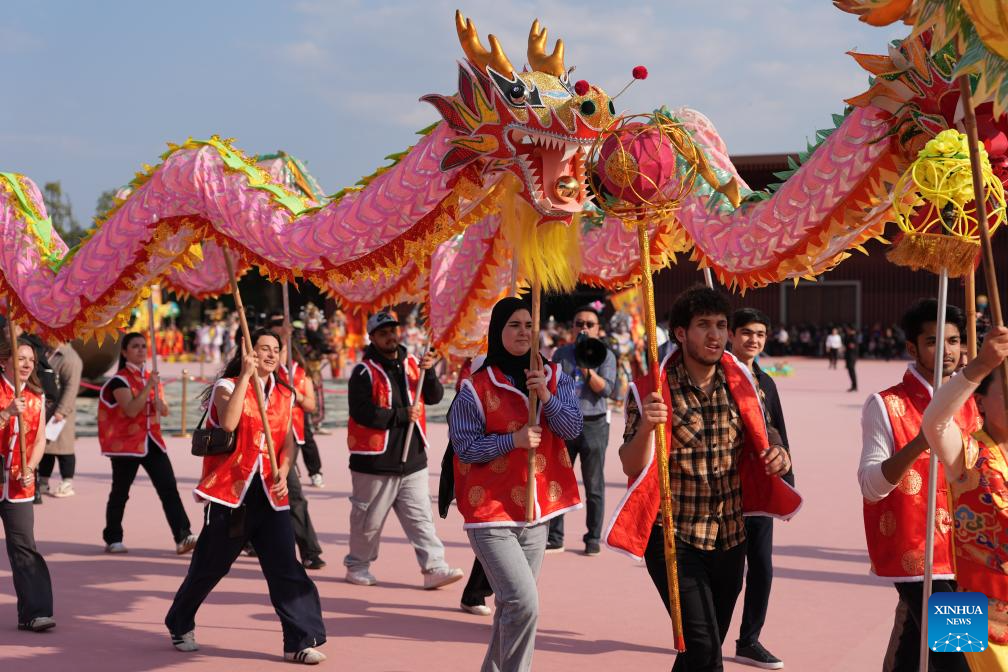 Artistas extranjeros realizan la Danza del Dragón de Tela de Fenghua durante un evento cultural, en Fenghua, en la provincia de Zhejiang, en el este de China, el 1 de marzo de 2025. La Danza del Dragón de Tela de Fenghua fue catalogada como patrimonio cultural inmaterial nacional de China en 2006. (Xinhua/Huang Zongzhi)