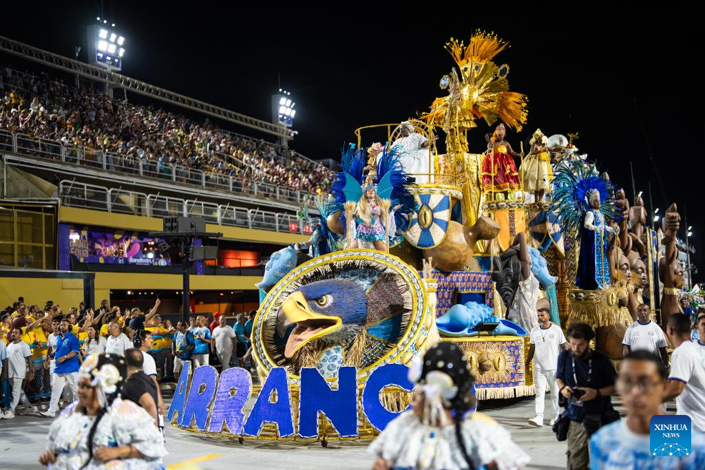 Participantes asisten a los desfiles del Carnaval de Río 2025 en la avenida Marques De Sapucai en Río de Janeiro, Brasil, el 28 de febrero de 2025. El alcalde de Río de Janeiro, Eduardo Paes, entregó el viernes una llave de oro al «Rey del Carnaval» Kaio Mackenzie, marcando la apertura oficial del carnaval en la ciudad. (Xinhua/Wang Tiancong.)