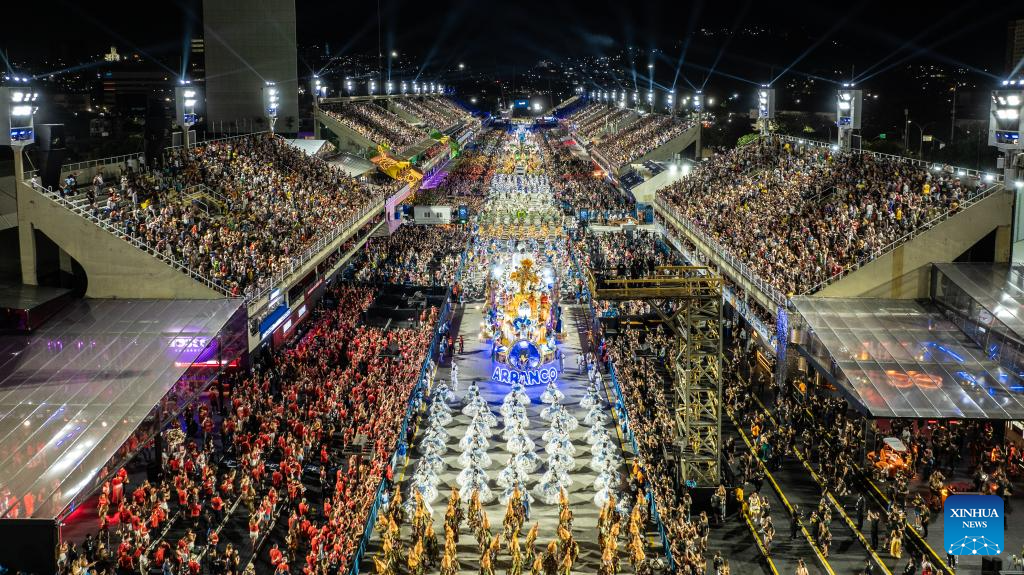 Una foto de dron muestra a los asistentes en los desfiles del Carnaval de Río 2025 en la avenida Marques De Sapucai en Río de Janeiro, Brasil, el 28 de febrero de 2025. El alcalde de Río de Janeiro, Eduardo Paes, entregó el viernes una llave de oro al «Rey del Carnaval» Kaio Mackenzie, marcando la apertura oficial del carnaval en la ciudad. (Xinhua/Wang Tiancong.)