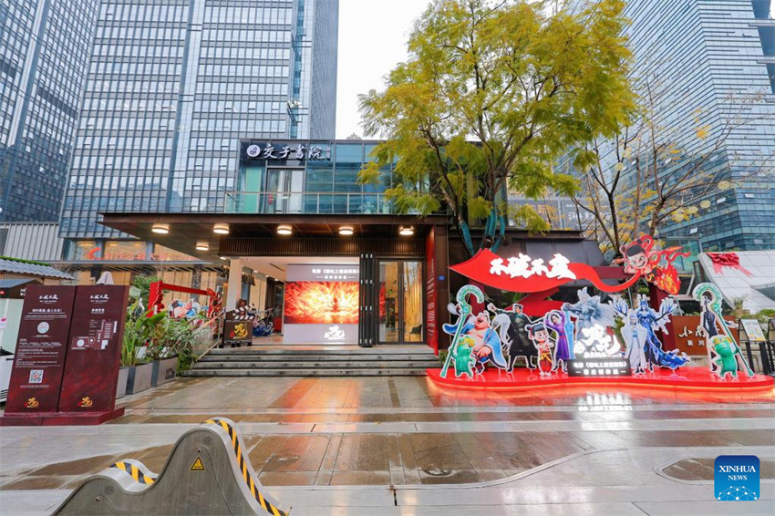 Esta foto tomada el 3 de marzo de 2025 muestra el exterior de una exposición sobre el viaje creativo de la superproducción de animación china Ne Zha 2 en Chengdu, provincia suroccidental china de Sichuan. (Xinhua/Tong Fang.)