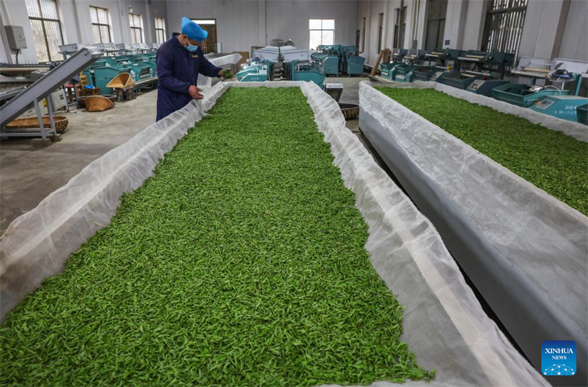 Un trabajador procesa hojas de té en el taller de una plantación de té en la localidad de Wangzhai del distrito de Wuyi, en la ciudad de Jinhua, provincia oriental china de Zhejiang, el 5 de marzo de 2025.
