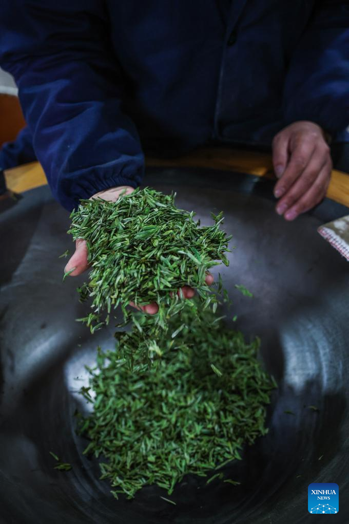 Un trabajador procesa hojas de té en el taller de una plantación de té en la localidad de Wangzhai del distrito de Wuyi, en la ciudad de Jinhua, provincia oriental china de Zhejiang, el 5 de marzo de 2025.