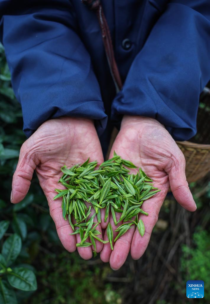 Un agricultor muestra hojas de té recién recolectadas en una plantación de té en la localidad de Wangzhai del distrito de Wuyi, en la ciudad de Jinhua, provincia oriental china de Zhejiang, el 5 de marzo de 2025.