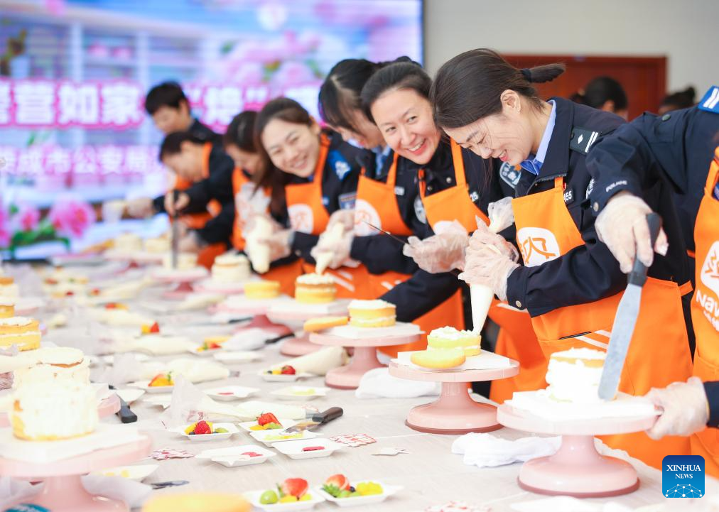 Mujeres policías elaboran pasteles durante un evento, en la ciudad de Rongcheng, en la provincia de Shandong, en el este de China, el 6 de marzo de 2025. Varias actividades se llevan a cabo en todo el país para conmemorar el Día Internacional de la Mujer. (Xinhua/Li Xinjun)