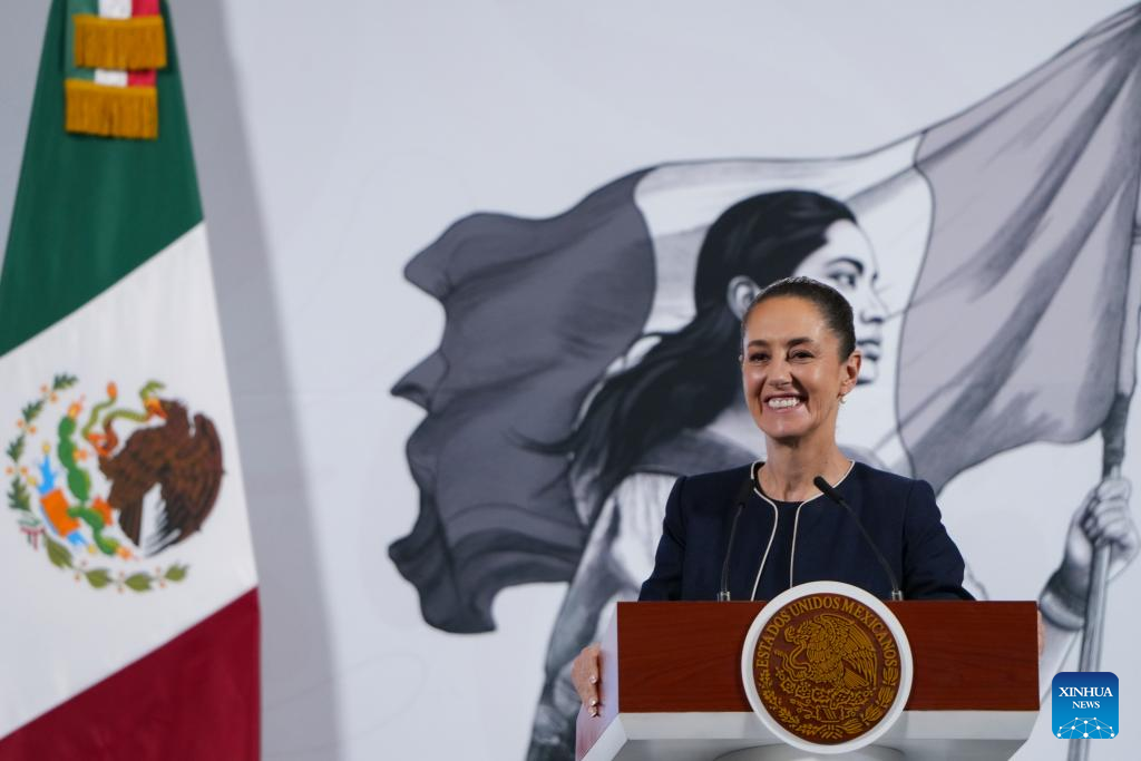 Imagen cedida por la Presidencia de México de la presidenta mexicana, Claudia Sheinbaum, sonriendo durante su conferencia de prensa matutina, en Palacio Nacional, en la Ciudad de México, capital de México, el 7 de marzo de 2025. El Gobierno de México está en negociaciones con su par estadounidense para evitar la imposición de aranceles del 25 por ciento sobre las exportaciones mexicanas de acero y aluminio, que entraría en vigor el próximo 12 de marzo, señaló el viernes el secretario de Economía, Marcelo Ebrard. (Xinhua/Presidencia de México)