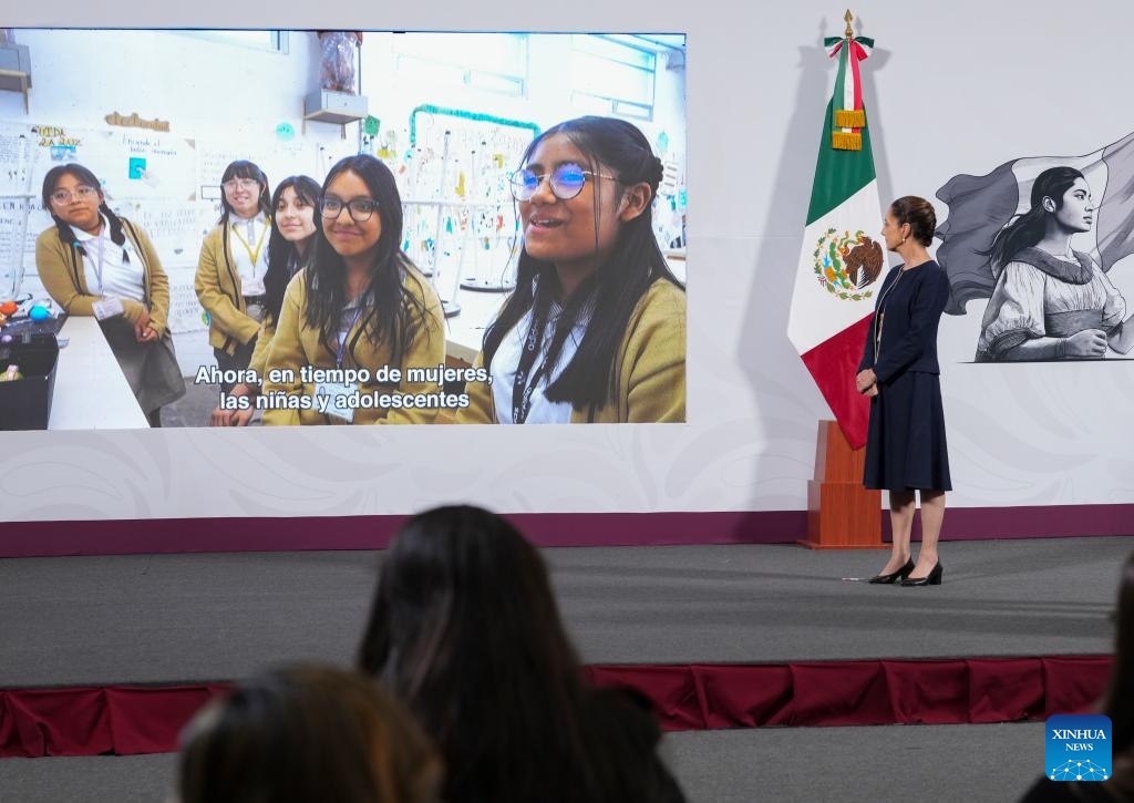 Imagen cedida por la Presidencia de México de la presidenta mexicana, Claudia Sheinbaum, observando una pantalla durante su conferencia de prensa matutina, en Palacio Nacional, en la Ciudad de México, capital de México, el 7 de marzo de 2025. El Gobierno de México está en negociaciones con su par estadounidense para evitar la imposición de aranceles del 25 por ciento sobre las exportaciones mexicanas de acero y aluminio, que entraría en vigor el próximo 12 de marzo, señaló el viernes el secretario de Economía, Marcelo Ebrard. (Xinhua/Presidencia de México)