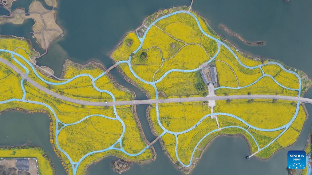 Vista aérea tomada con un dron del 3 de marzo de 2025 de campos de canola en flor en un parque de humedales, en la ciudad de Meishan, en la provincia de Sichuan, en el suroeste de China. (Xinhua/Weng Guangjian)