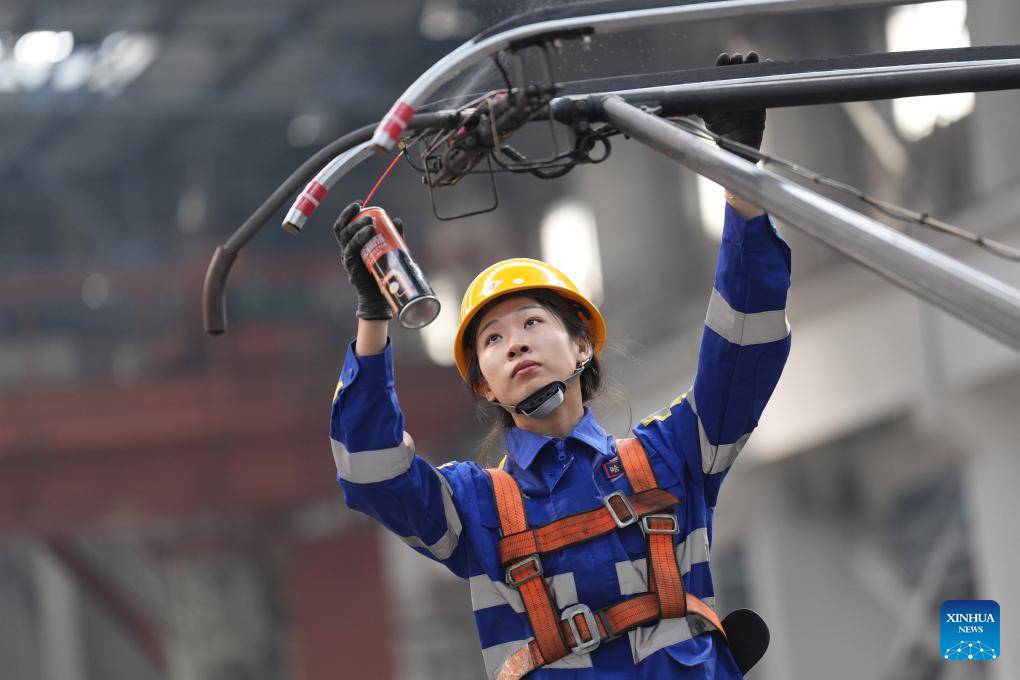 Imagen del 6 de marzo de 2025 de Wang Jiayi, una mecánica de trenes, dando mantenimiento a un pantógrafo de una locomotora en un depósito de China Railway Harbin Group Co., Ltd., en Harbin, en la provincia de Heilongjiang, en el noreste de China. En una impresionante demostración de habilidad y dedicación, un equipo de mantenimiento femenino está atareado examinando y proporcionando mantenimiento a los trenes en un depósito de China Railway Harbin Group Co., Ltd. Creado en 2023, el equipo femenino está formado por siete mecánicas de locomotoras con una edad promedio de 24 años, todas ellas con título universitario. Cuando la agricultura de primavera ha comenzado en Heilongjiang, el principal productor de granos de China, cada mecánica debe completar el trabajo de mantenimiento de 3 locomotoras diariamente para garantizar el transporte seguro de los suministros agrícolas durante la temporada de arado de primavera. "Al ver que los trenes después de nuestro mantenimiento funcionan sanos y salvos, me enorgullezco de mi trabajo", dijo Wang Jiayi, jefa del equipo. (Xinhua/Wang Song)