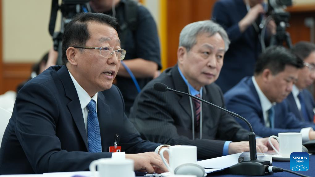 Feng Xingya (izq.), diputado de la XIV Asamblea Popular Nacional (APN), habla en una reunión de grupo de la delegación de la provincia de Guangdong en la tercera sesión de la XIV APN en Beijing, capital de China, el 6 de marzo de 2025. (Xinhua/Liu Dawei)