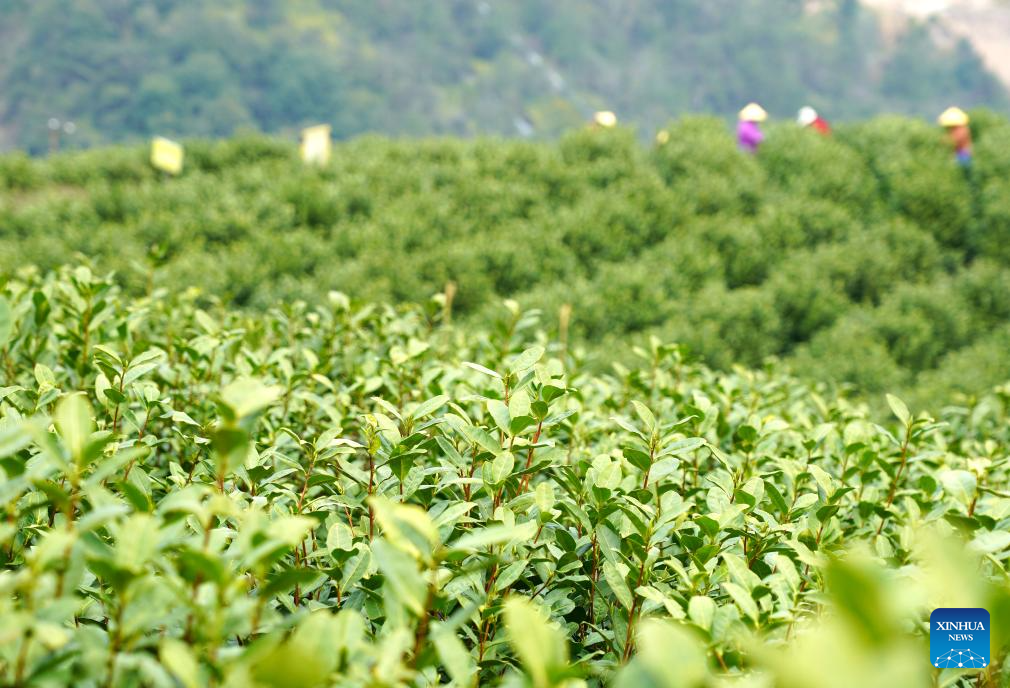 Agricultores recogen hojas de té en un campo de té en la aldea Zhongyan de la ciudad de Leqing, provincia oriental china de Zhejiang, el 9 de marzo de 2025. (Fotografía de Cai Kuanyuan/Xinhua.)