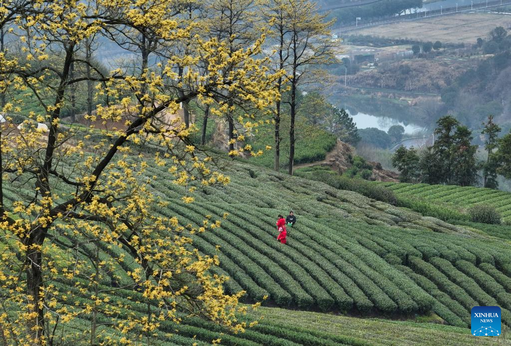 Agricultoras recogen hojas de té en un campo de té en la aldea de Xiayanbei del municipio de Dongming, distrito de Xinchang, provincia oriental china de Zhejiang, el 10 de marzo de 2025. (Xinhua/Weng Xinyang.)