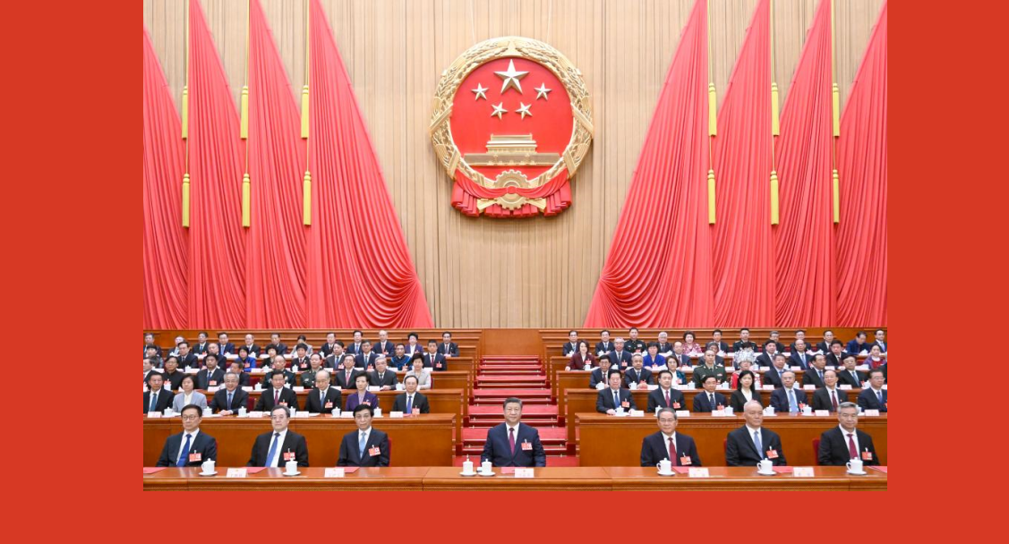 El presidente chino, Xi Jinping, y otros líderes, entre ellos Li Qiang, Wang Huning, Cai Qi, Ding Xuexiang, Li Xi y Han Zheng, asistieron a la reunión de clausura de la sesión en el Gran Palacio del Pueblo en Beijing.