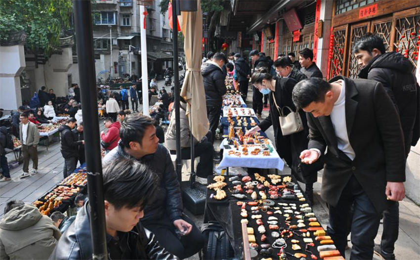Personas compran productos tallados en piedra de Shoushan en un mercado de Fuzhou, provincia suroriental china de Fujian, el 8 de marzo de 2025. (Xinhua/Jiang Kehong.)