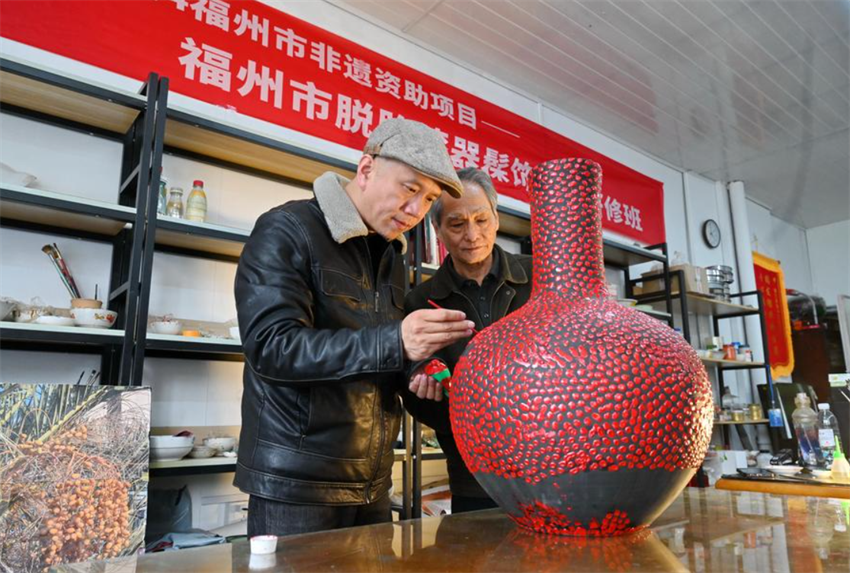El artesano Chen Tiangan (dcha.) instruye a un estudiante sobre la técnica de la laca en un estudio en Fuzhou, provincia suroriental china de Fujian, el 6 de marzo de 2025. (Xinhua/Lin Shanchuan.)