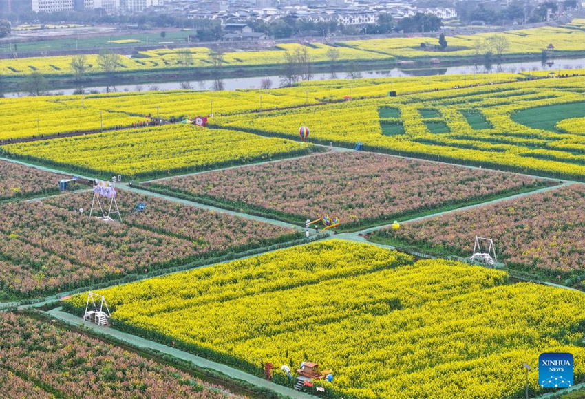 Una foto aérea tomada por un dron el 12 de marzo de 2025 muestra el paisaje de las flores de colza en el paisaje de Chongkan, distrito de Tongnan, en la municipalidad suroccidental china de Chongqing, el 12 de marzo de 2025. (Xinhua/Wang Quanchao.)