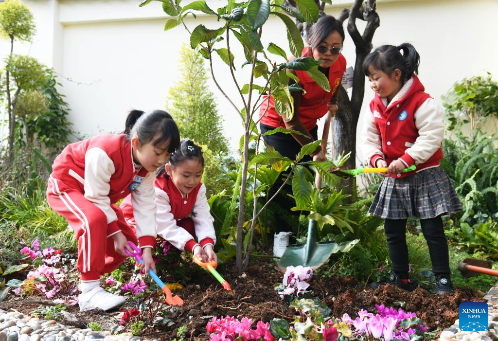 Niñas de una guardería plantan plantones con su profesora en Lijiang, provincia suroccidental china de Yunnan, el 12 de marzo de 2025. El miércoles se celebraron en todo el país actos de plantación de árboles para conmemorar el Día Nacional de Plantación de Árboles de China. (Foto de Zhao Qingzu/Xinhua.)