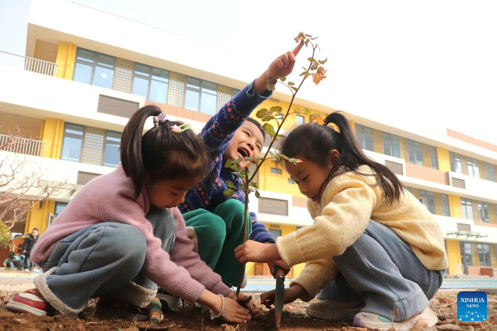 Niños plantan un plantón en un jardín de infancia en la ciudad de Gaomi, provincia oriental china de Shandong, el 12 de marzo de 2025. (Foto de Li Haitao/Xinhua.)
