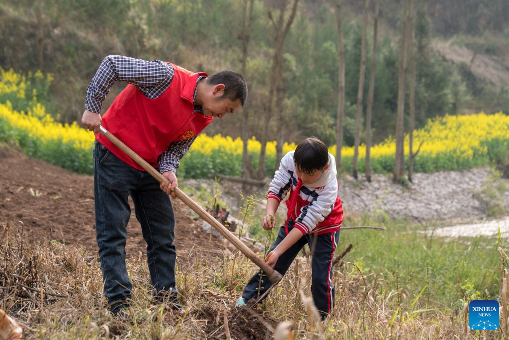 Un voluntario planta un plantón de árbol con un estudiante de primaria en el distrito de Luoping, provincia suroccidental china de Yunnan, el 12 de marzo de 2025. (Foto de Peng Yikai/Xinhua.)