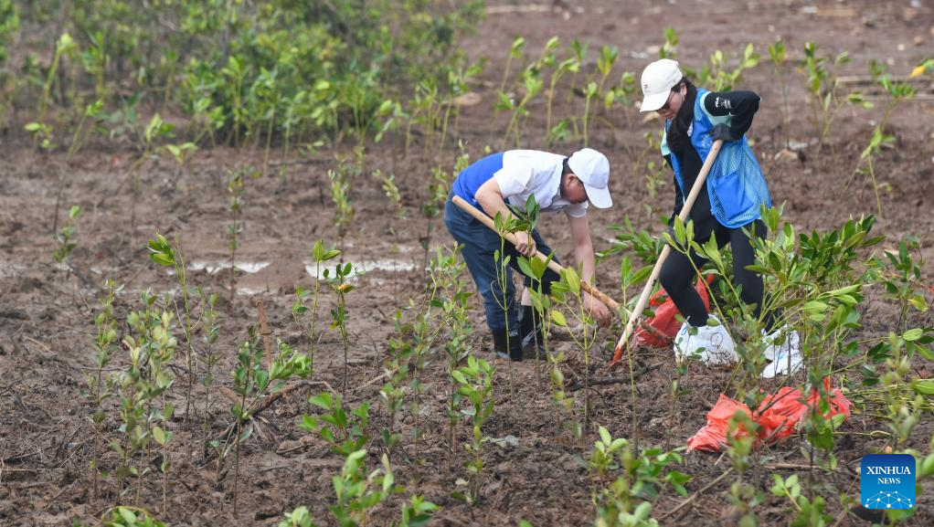 Voluntarios plantan plantones de manglares en la Reserva Natural Nacional de Dongzhaigang, en Haikou, provincia meridional china de Hainan, el 12 de marzo de 2025. (Xinhua/Yang Guanyu.)