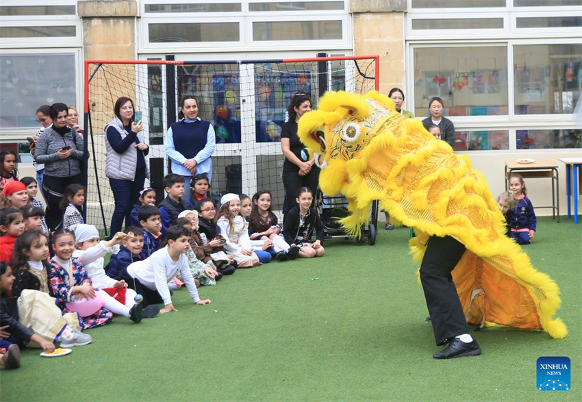 La gente observa la danza del león durante un evento multicultural en la Escuela Primaria Paola en Paola, Malta, el 12 de marzo de 2025. (Xinhua/Chen Wenxian.)