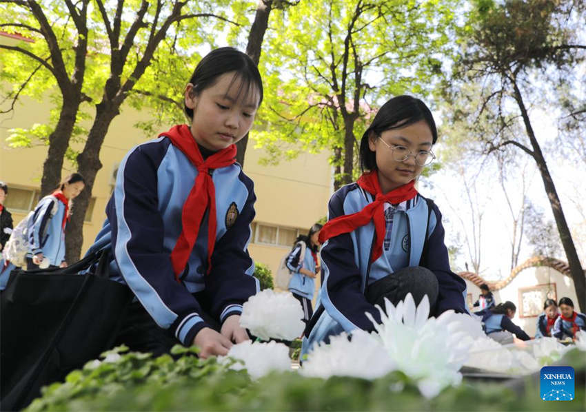 Estudiantes rinden homenaje a los mártires en un cementerio de mártires, en la ciudad de Jiyuan de la provincia de Henan, en el centro de China, el 2 de abril de 2025. Personas de todo el país asisten a las actividades de limpieza de tumbas para rendir homenaje a los mártires previo al Festival Qingming, que se celebra el 4 de abril este año. (Xinhua/Duan Erping)