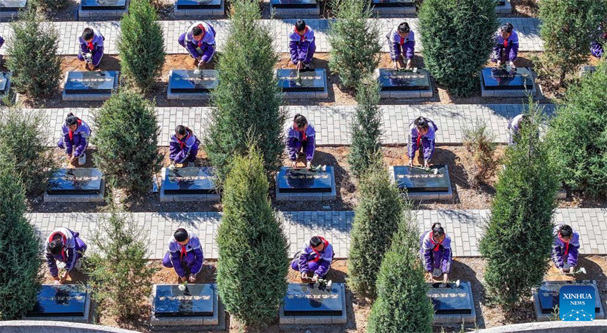 Vista aérea tomada con un dron el 2 de abril de 2025 de estudiantes rindiendo homenaje a los mártires en un cementerio de mártires, en la ciudad de Zunhua, en la provincia de Hebei, en el norte de China. Personas de todo el país asisten a las actividades de limpieza de tumbas para rendir homenaje a los mártires previo al Festival Qingming, que se celebra el 4 de abril este año. (Xinhua/Liu Mancang)