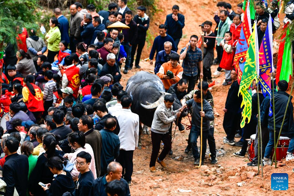 Un toro es preparado para participar en un evento de corrida de toros folclórico para celebrar el Festival de Guzang, en la aldea de Dongzhuang, en el distrito de Jinping de la provincia de Guizhou, en el suroeste de China, el 6 de abril de 2025. El Festival de Guzang es el festival más importante para el pueblo miao para ofrecer sacrificios a sus ancestros. (Xinhua/Yang Wenbin)