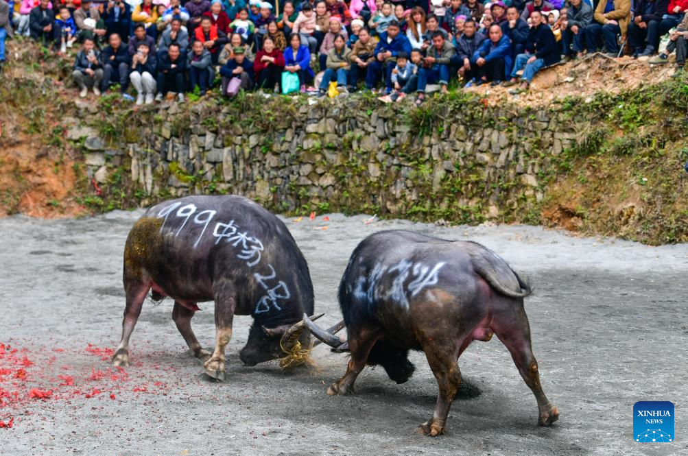 Personas observan toros pelear durante un evento de corrida de toros folclórico para celebrar el Festival de Guzang, en la aldea de Dongzhuang, en el distrito de Jinping de la provincia de Guizhou, en el suroeste de China, el 6 de abril de 2025. El Festival de Guzang es el festival más importante para el pueblo miao para ofrecer sacrificios a sus ancestros. (Xinhua/Yang Wenbin)