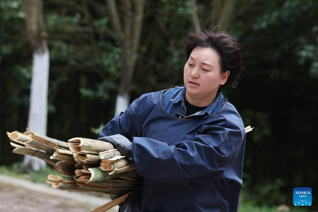 La cuidadora de pandas gigantes, Li Rong, lleva bambú procesado para pandas gigantes al recinto de la base de pandas gigantes de Shenshuping de la Reserva Natural Nacional de Wolong, en la provincia suroccidental china de Sichuan, el 27 de marzo de 2025. (Xinhua/Meng Tao.)