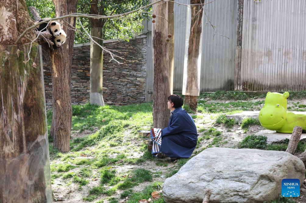 La cuidadora de pandas gigantes, Li Rong, llama a los cachorros de panda para que beban leche en la base de pandas gigantes de Shenshuping de la Reserva Natural Nacional de Wolong, en la provincia suroccidental china de Sichuan, el 27 de marzo de 2025. (Xinhua/Meng Tao.)